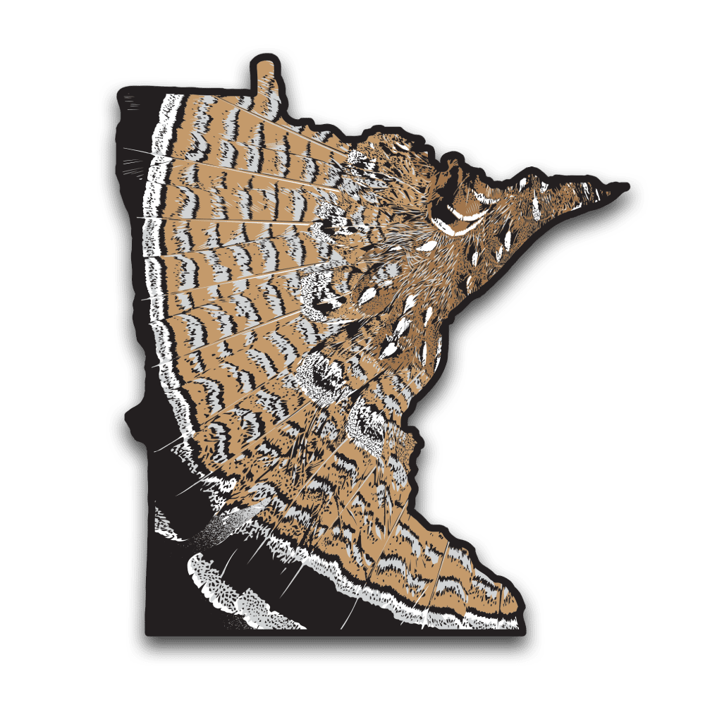 These Minnesota Ruffed Grouse matte finish vinyl stickers are 4″ tall and are tribute to the cornerstone species in which Project Upland was founded. Nothing speaks to the beauty of a ruffed grouse like the tail feathers of this king of the upland birds. This second edition features a split color phase ruffed grouse fan. Please email info@projectupland.com if you want us to make your state next!