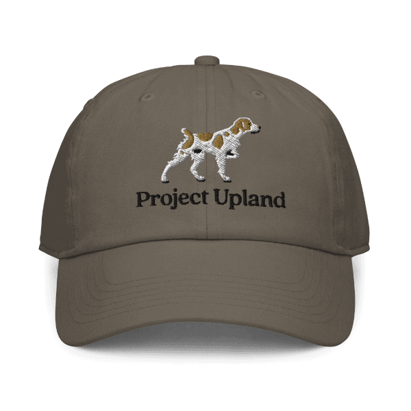 This unstructured dad hat, olive in color and made of brushed twill, features a directly embroidered Brittany on point over the Project Upland logo.