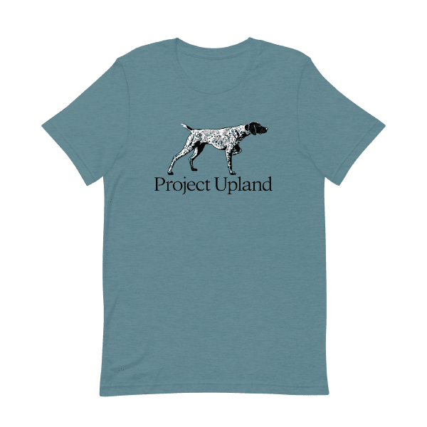 Embrace the spirit of the hunt with this classic Project Upland logo t-shirt, showcasing the iconic German Shorthaired Pointer in a poised and elegant point. Celebrate America’s favorite versatile hunting dog with this simple yet striking design. Perfect for the field or casual wear, this tee is a tribute to the excellence of the GSP’s performance.