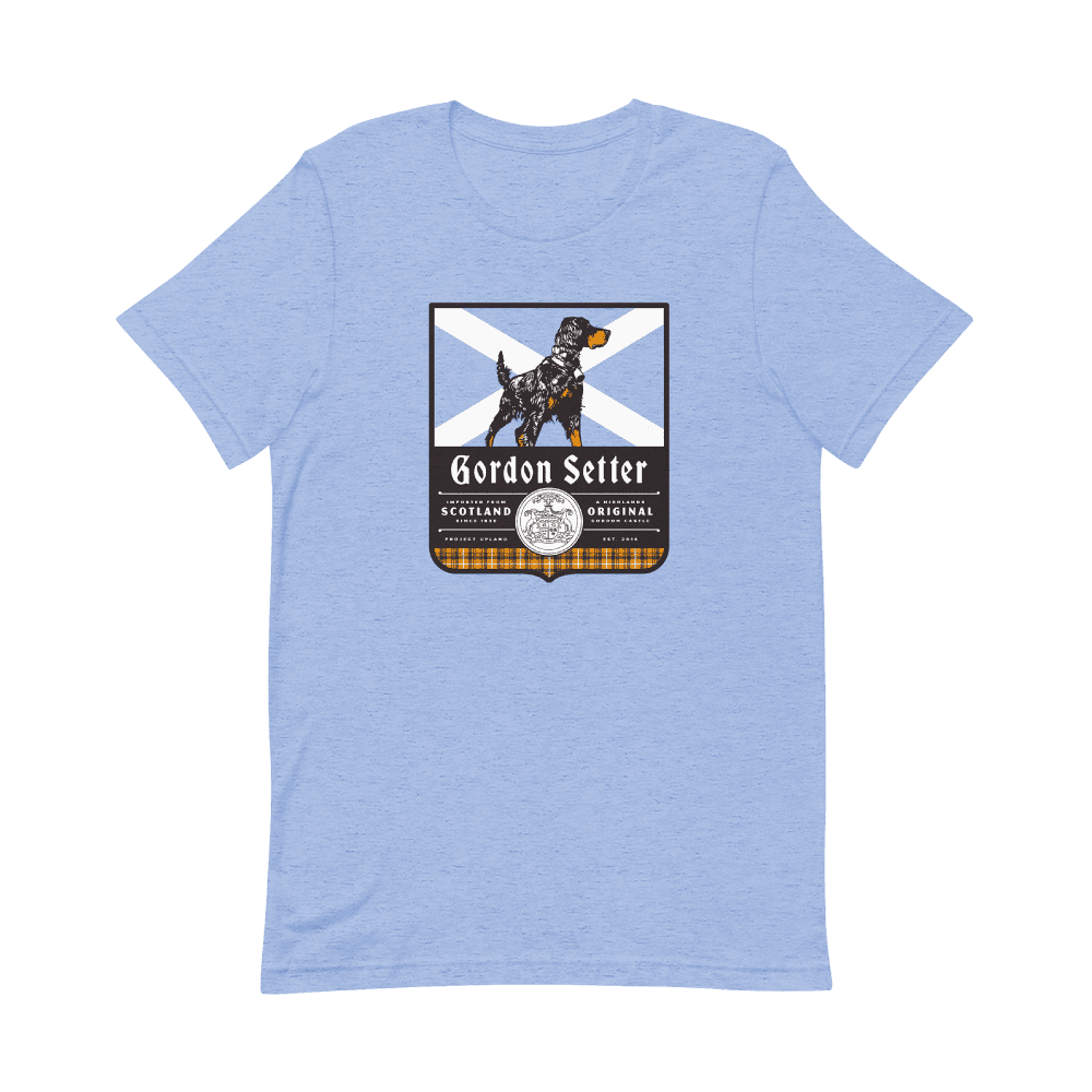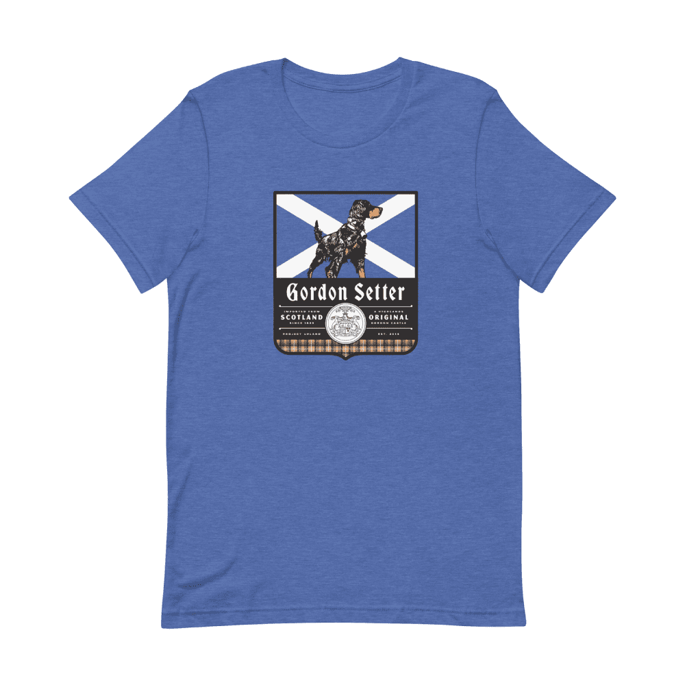 The Gordon Setter is a famous Scottish pointing dog breed with a storied history in both North American and abroad. This shirt features the Scottish flag along with the first U.S. importing date of 1839.