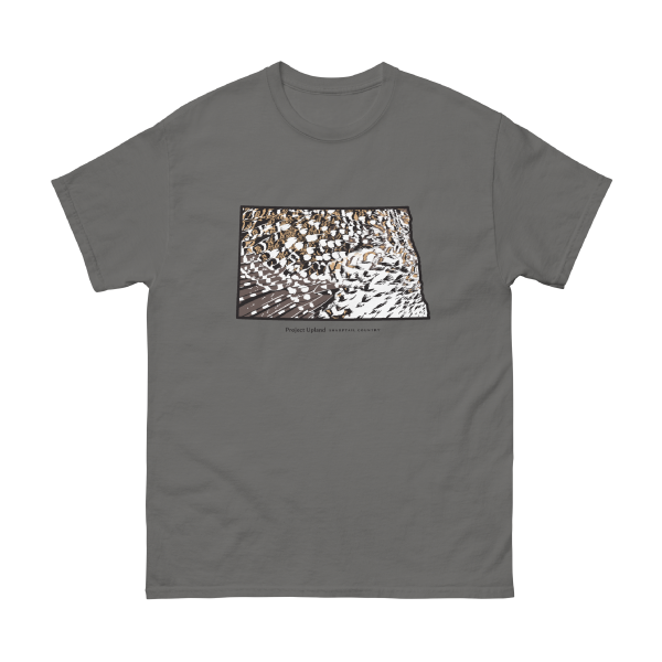 The sharp-tailed grouse is synonymous with North Dakota. This “Sharptail Country” design shows the distinct feathers of the sharp-tailed grouse contained in the shape of this iconic bird hunting state.