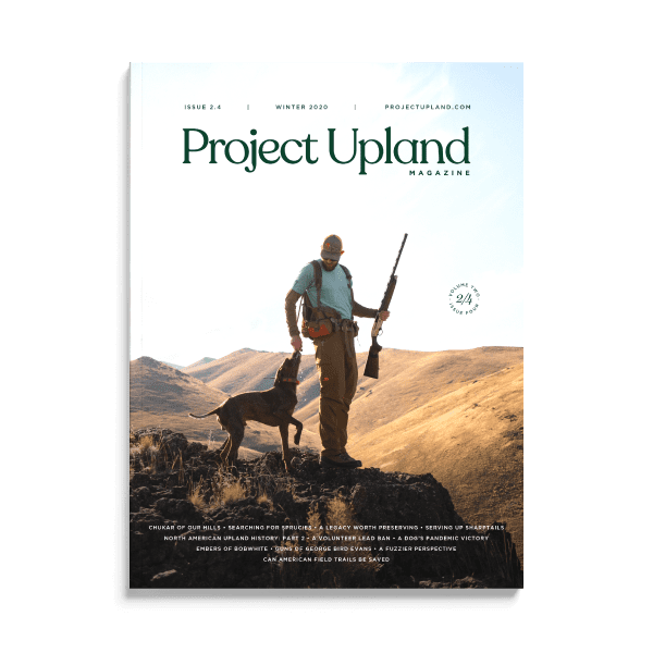 Volume Two, Issue Four of Project Upland Magazine featuring the cover image Alec Garcia from the film and group Chukar Chasers takes us from the chukar hills of Nevada to back all the back in time with shotguns and iconic people. We explore the future of field trials, the impacts of lead on our culture, even some sharptail cooking to go along with it all.