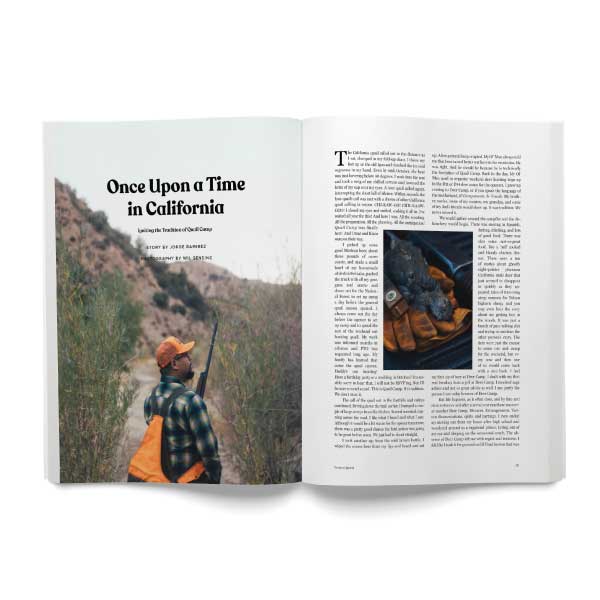 Volume Three, Issue Two of Project Upland Magazine featuring the cover image of artist Jorge Ramirez, founder of UplandJitsu.com, who explores his quail camp traditions of Southern California. Then from Spanish guns to the Project Upland crowd-sourced guns by CZ USA to Call of the Upland with Pheasants Forever and of course dogs . . .