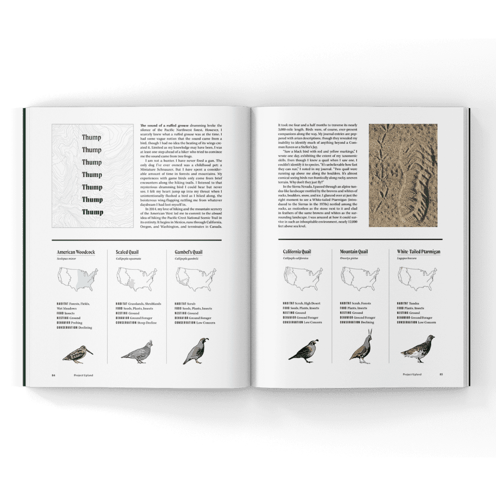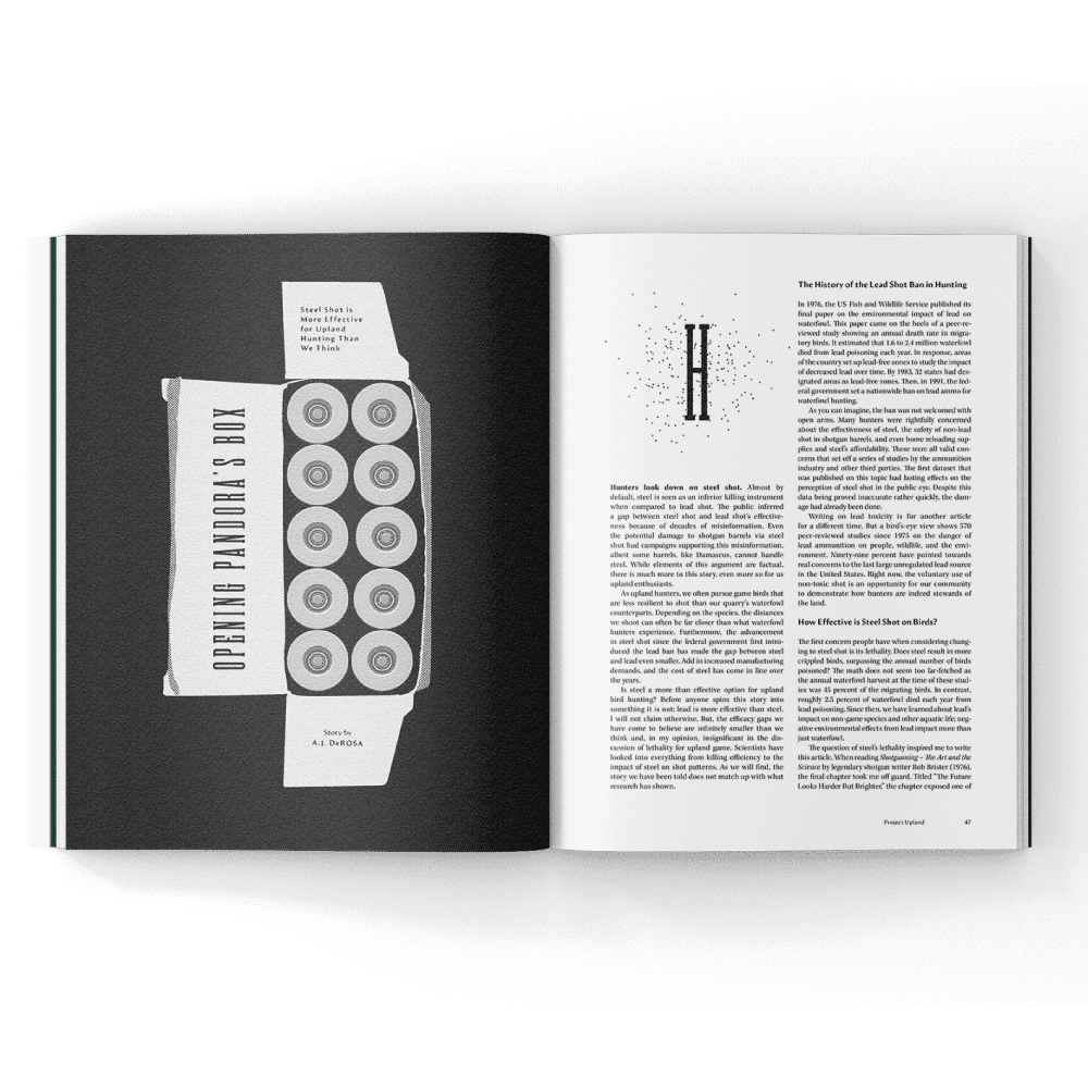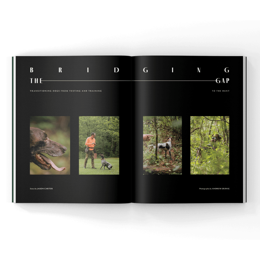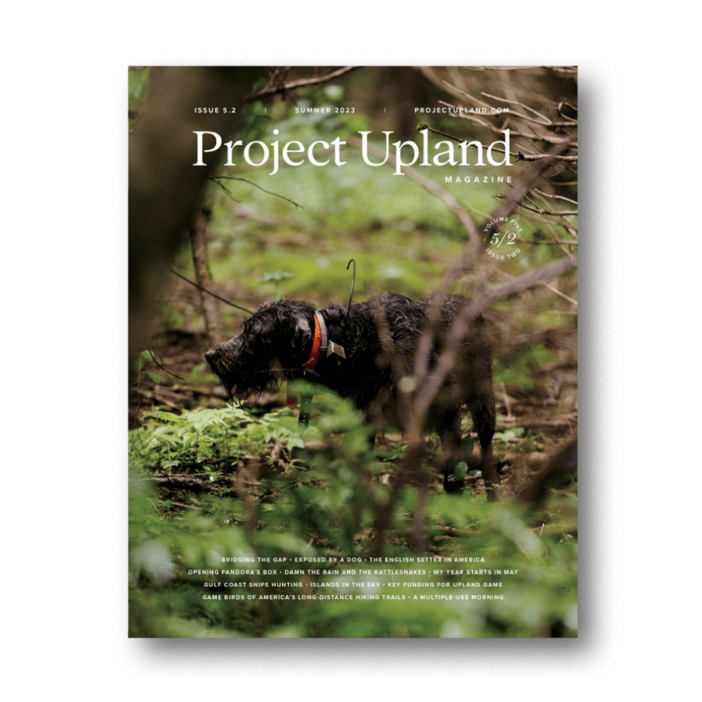 Volume Five, Issue Two of Project Upland Magazine features a cover image of a Wirehaired Pointing Griffon from the cover story Bridging the Gap by Jason Carter. This issue explores a range of wild game cuisine along with the traditions and evolution of the English Setter in America with dog historian Craig Koshyk. Further we explore current conservation issues, stories of the American uplands, and even a look at the ballistics of steel shot. We even included an unusual perspective of game birds on the Pacific Crest Trail.