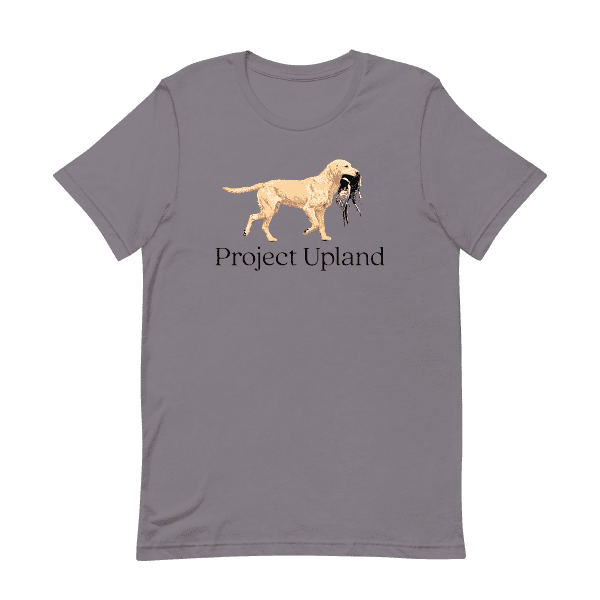 Do you love Labrador Retrievers? This iconic bird dog has withstood the test of time as the most popular hunting dog breed. This new t-shirt design on heather storm (heather blue) features a classic Yellow Labrador Retriever bringing a rooster to hand.